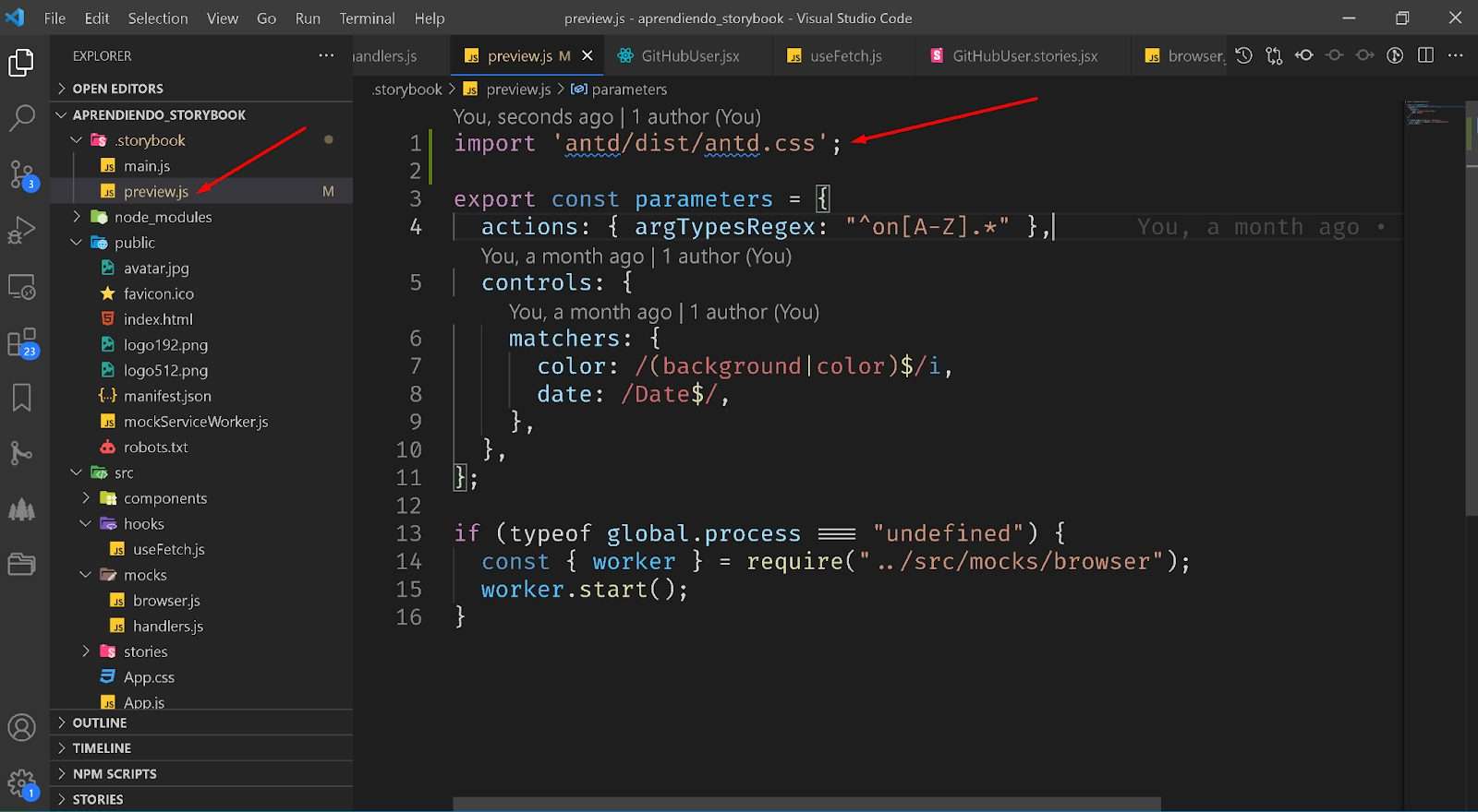 When the installation is finished we have to tell Storybook to use Antd’s CSS style sheets, for which we go to the .storybook folder inside the project and look for the preview.js file and add at the beginning the line: import ‘antd/dist/antd.css’;