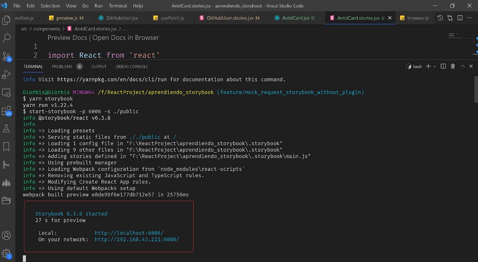 With this we can now test the command to display the Storybook and check if the Card component loaded correctly, just like the examples on the And Desing site. To do this we execute the command: